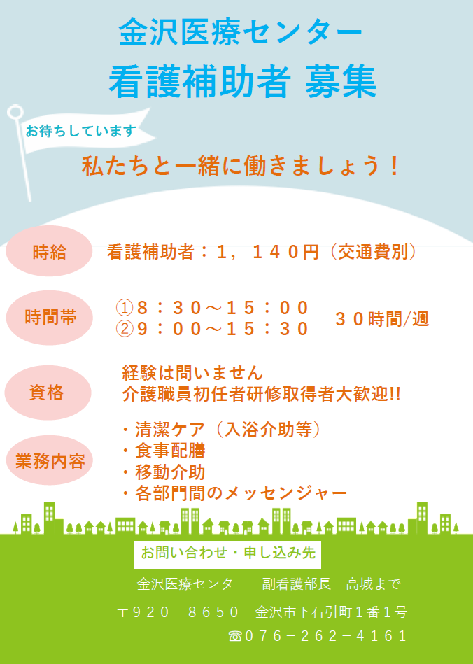 (1)提出書類 履歴書(市販のもの、写真添付) ハローワークからの紹介状 (2)提出先・問い合せ先 独立行政法人国立病院機構 金沢医療センター 管理課 給与係長 宛 〒920-8650 金沢市下石引町1番1号 TEL:076-262-4161(代表) 内線 2404 E-mail:302-kyuuyo@mail.hosp.go.jp |